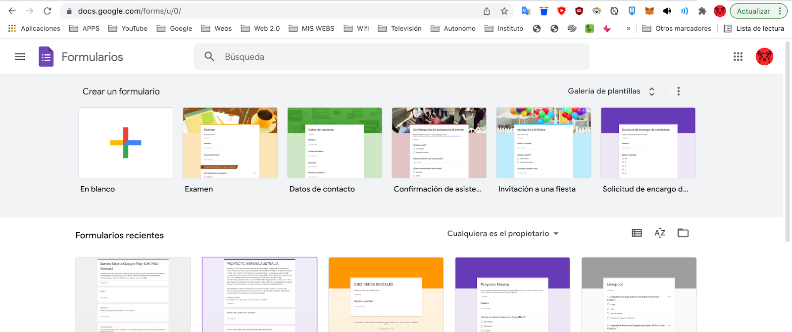 1. Entramos en la web de formularios de Google, y aquí podemos escoger la plantilla que queramos o un proyecto en blanco. En mi caso cogeré la plantilla de “Datos de contacto”.