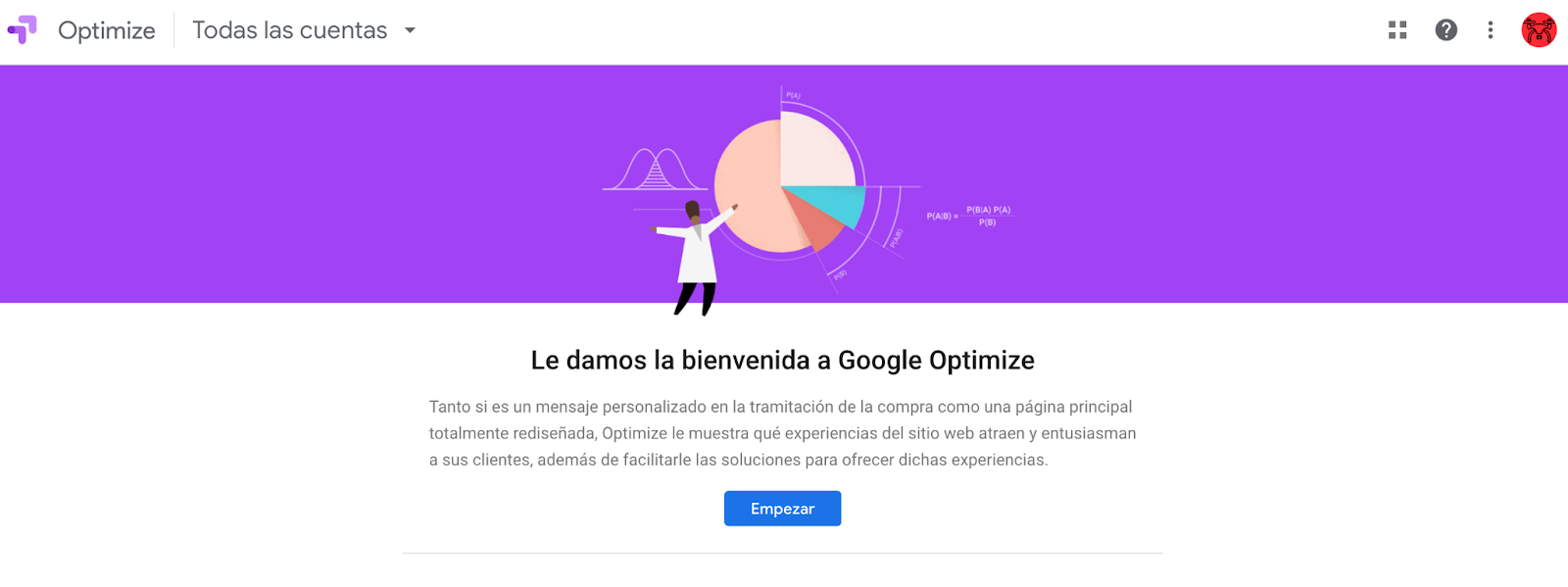 1. Entramos en la web de Google Optimize y pulsamos en “Empezar”.