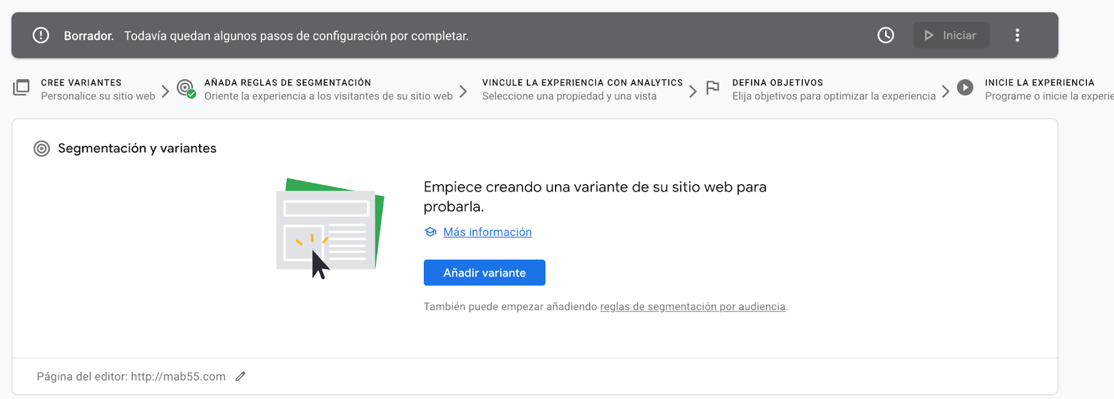 5. Y aquí es donde vamos creando las diferente variantes de nuestro sitio web. Una vez tengamos todo listo, pulsamos en “Iniciar” para empezar con las pruebas.