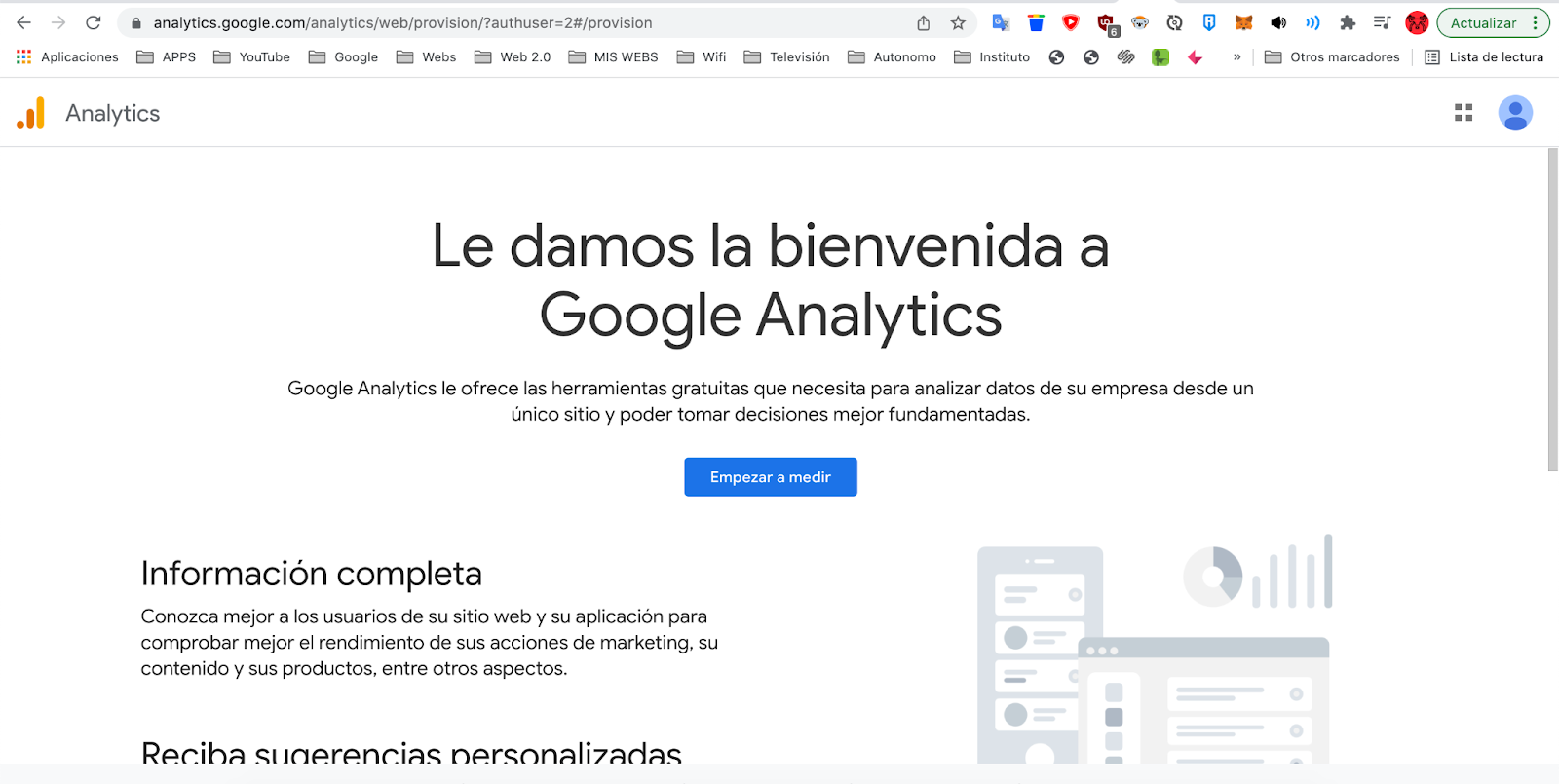 1. Entramos en la web de Google Analytics y pulsamos en “Empezar a medir” para empezar a crear nuestra cuenta.