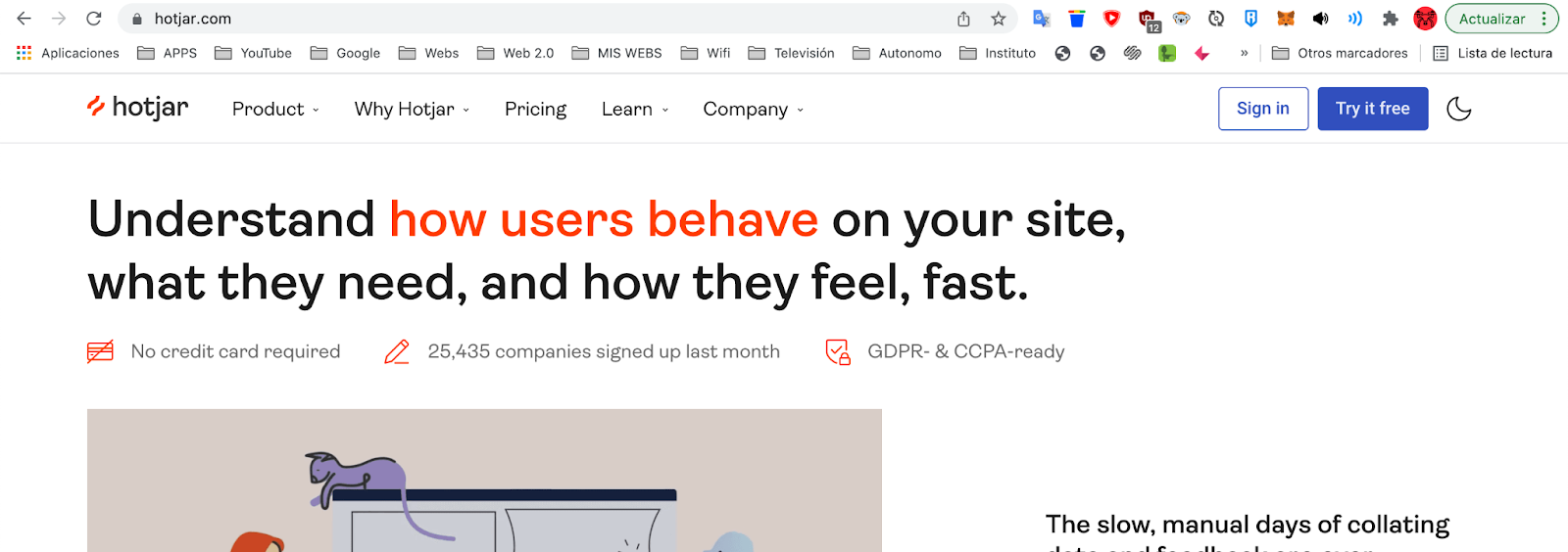 1. Entramos en Hotjar y pulsamos en “Try it free” para crearnos una cuenta de prueba.